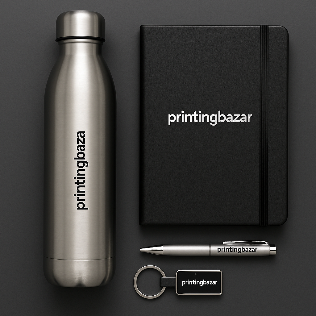 A perfect blend of elegance and utility β this premium corporate gift set from PrintingBazar makes a memorable impression. Designed for professionals, clients, and employees, it includes a sleek silver water bottle, executive black notebook, stylish metallic pen, and durable keychain, each branded with your logo absolutely free.